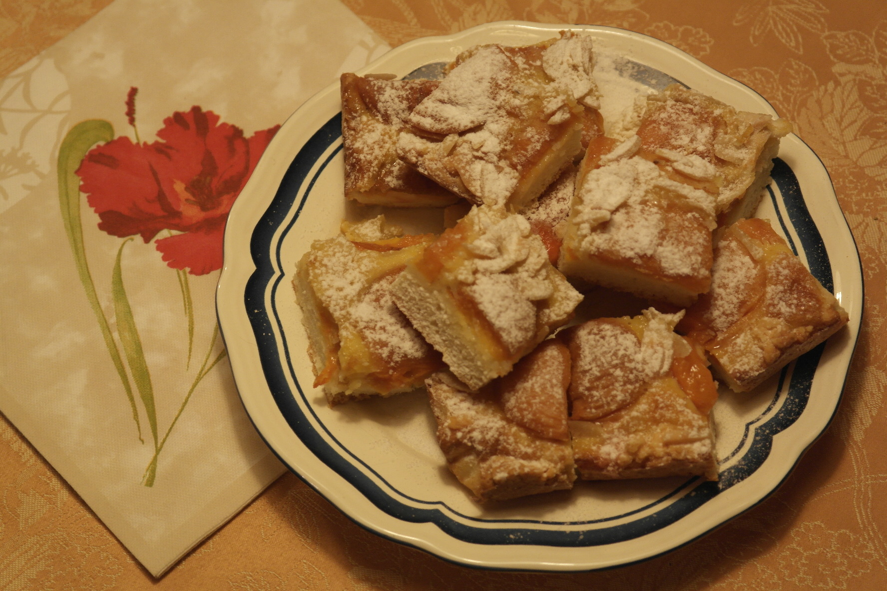 Polevu nalijte na těsto a meruňky narovnejte řeznou stranou dolů. Posypte mandlovými lupínky