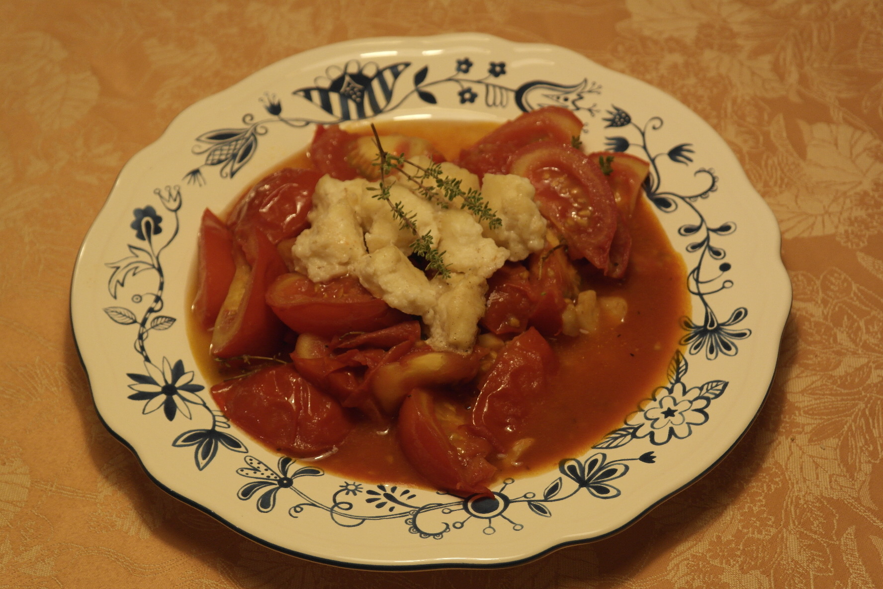 Noky dejte do šalvějového másla. Na talíř nandejte rajčata a na ně položte noky, ozdobte snítkou tymiánu.