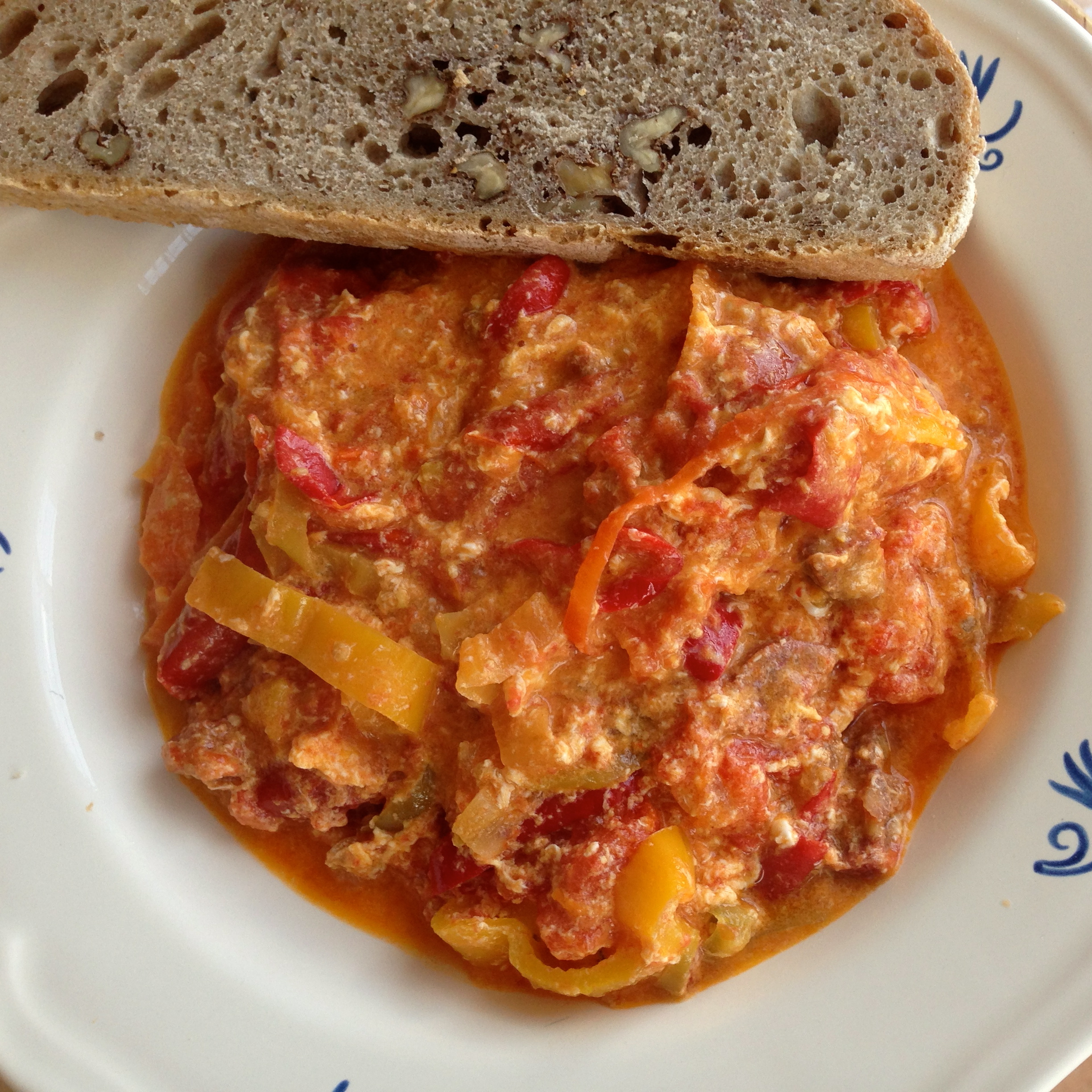 A klasická příprava. Na oleji orestujte cibuli, na ní dejte orestovat klobásu pokrájenou na kostičky. Přidejte oboje očištěné pokrájené papriky, přiklopte a nechte mírně podusit. Přidejte pokrájená rajčata, osolte a opepřete, cca 5 minut nechte podusit přiklopené a pak naopak nechte vařit 5 minut odklopené, aby se odpařila přebytečná voda z rajčat. Nakonec přidejte rozšlehaná vejce, zamíchejte, případně ještě dosolte a opepřete. Jako příloha mohou být brambory, ale my máme nejraději lečo mečo s mým domácím chlebem. Dle přiloženého fota můžete vidět, že ho připravuji vždy velký hrnec :-).