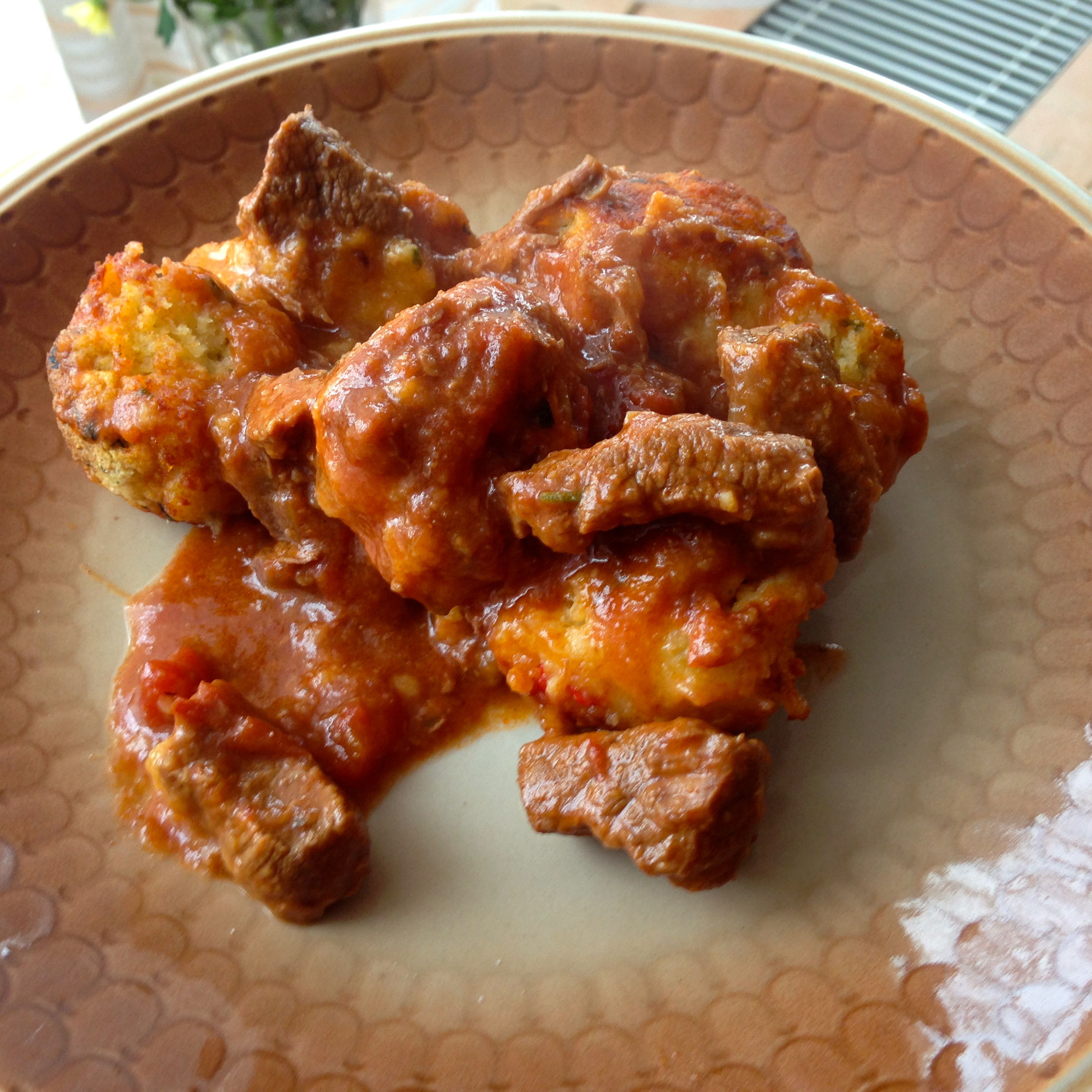 Tak tomu říkám tlaky. Pozvala jsem na oběd ségru se švárou a tatínka, vymyslela jsem (nebo spíše jsem se vzhlédla) recept, uvařila, snědla, odjela za babičkou do nemocnice, navštívila tchyni s tchánem, tam si přečetla, že popečeníčko dalo na blog výborný dezert ze tří mlék a slíbilo recept na dnešní oběd na Le bistrot, přijedu ke kamarádce do Dejvic, abych jí půjčila knihu a ta už na mne volá, že se těší na polentové knedlíčky :-). Dobře všeho nechám a dávám recept na blog. Recept je opravdu od Dity Pecháčkové alias Dituny, ale ne z její kuchařky, ale z časopisu Albert, který mám v iPadu rok, ale až teď jsem jím naprosto okouzlená. Oběd byl pro 8 lidí, tak si porci upravte pro vaši potřebu.