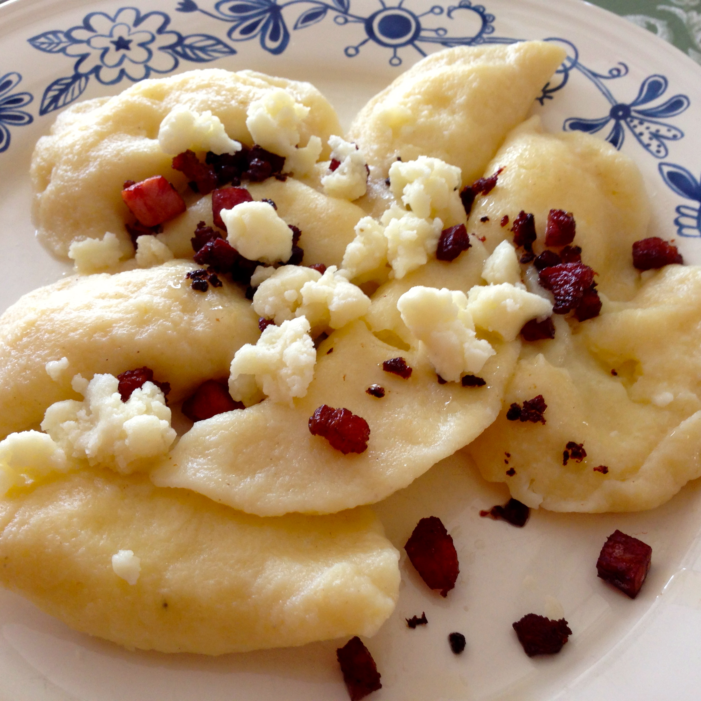 Každý kdo jezdí na Slovensko ví, že si musí dát strapačky, halušky, nebo pirohy s brynzou. Jak jsem minule při polévce ze Slovenska slíbila, další recept bude pirohy s brynzou. Pro mne velké překvapení bylo, že těsto je bramborové, další překvapení bylo, že nádivka není jen brynza, ale brambory smíchané s brynzou, třetí překvapení bylo, jak jednoduše se s těstem pracovalo, šlo to samo. Poslední, čtvrté překvapení bylo, že to bylo fakt moc dobré. Myslím, že po dnešní zkoušce se nebudu bát toto jídlo zařadit do běžného repertoáru. Recept je na 4 porce.