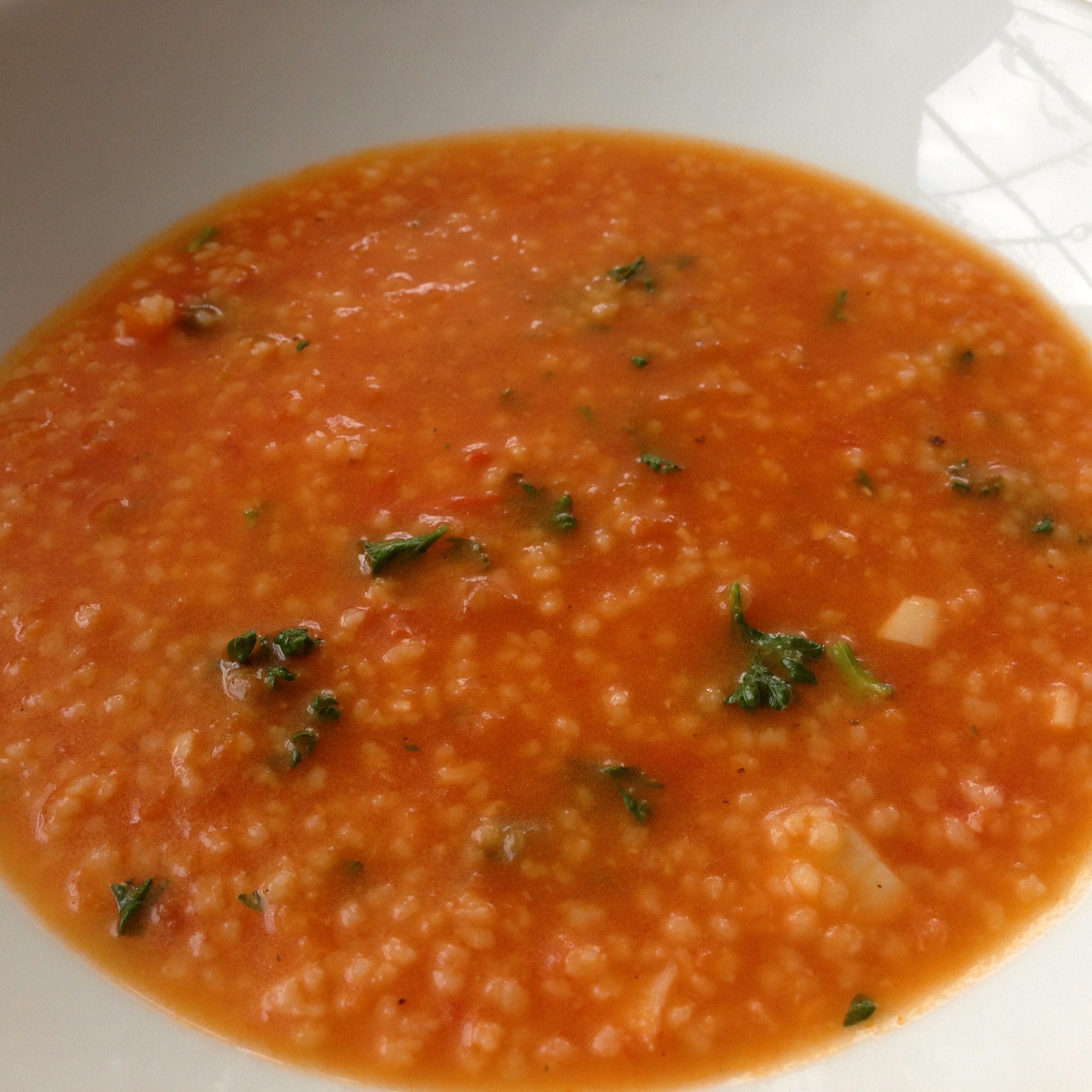 Mne by zajímalo, kolik druhů rajčatové polévky je, asi nekonečno. Tato polévka má řádně italskou chuť, jak se v ní restuje ten česnek, tak to báječně voní a i chutná. Kuskus je taky neuvěřitelná věc, je udělaný ani se neotočíte. Mnoho lidí si myslí, že kuskus je obilovina, není! Je to těstovina připravená z tvrdozrnné pšenice. Je to velmi tradiční potravina v severní Africe. Recept je k přípravě 4 porcí a příprava je rachlá.