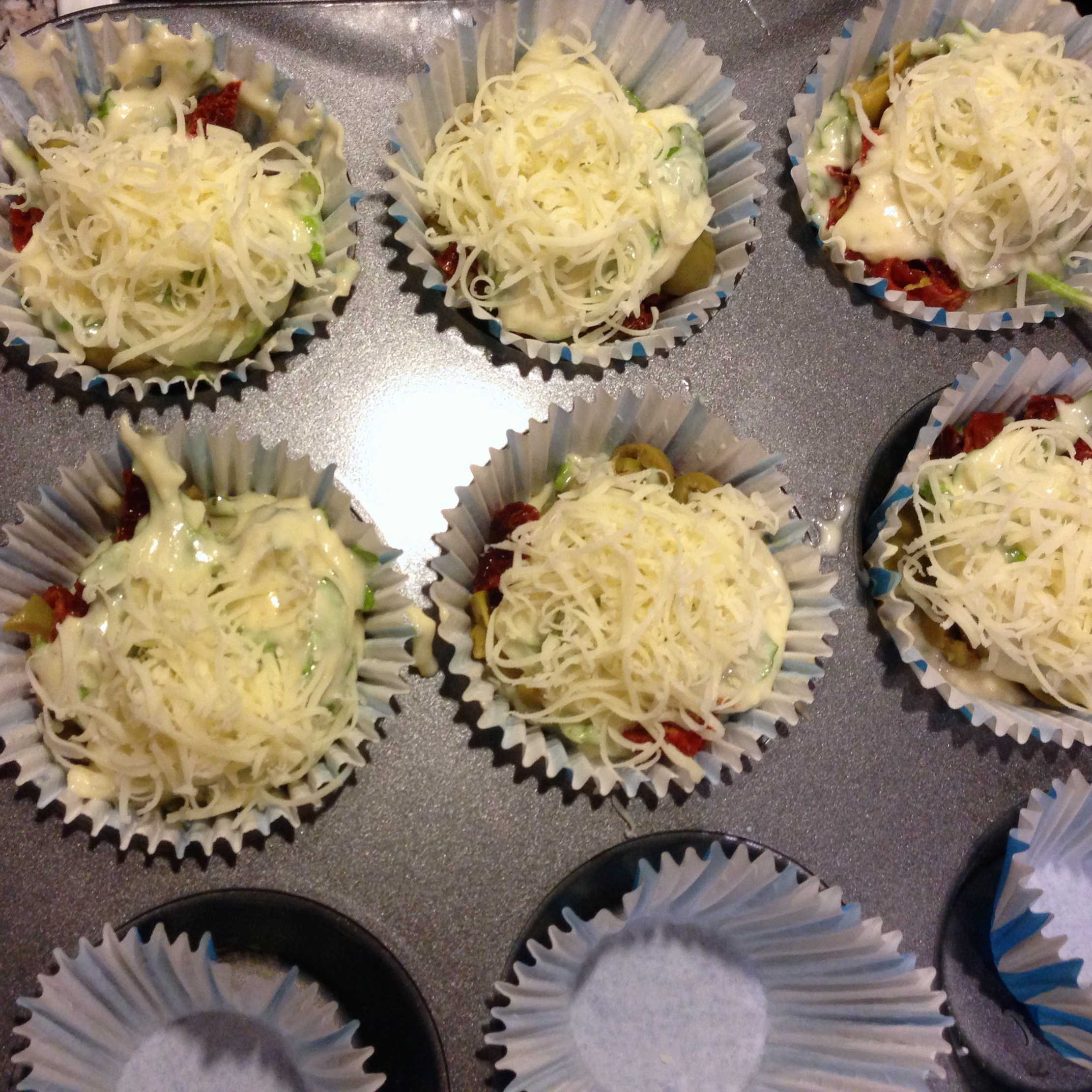 V míse smíchejte vejce s nastrouhaným sýrem (trochu si nechte na ozdobu), a mlékem. Přidejte mouku, pr. do peč., sůl, pepř, olej a nakonec vmíchejte rukolu. Připravte si košíčky na muffiny a na dno vlijte těsto, pak do košíčku dejte pokrájenou směs rajčat a oliv a zase zalijte těstem. Ozdobte sýrem a dejte péct na 20 minut 180°C. Muffiny jsem ještě ozdobila čerstvou rukolou, zelená je zelená :-).